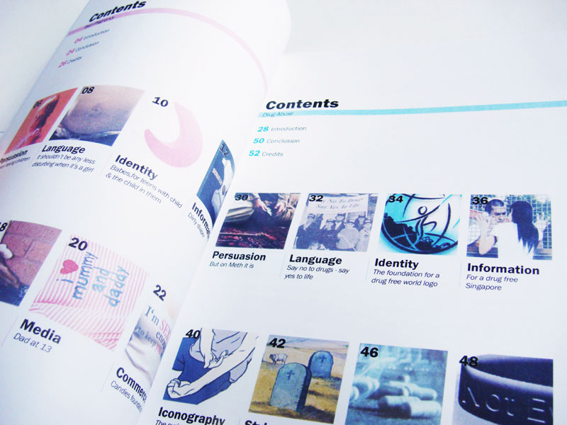 Software: Indesign/Photoshop Task: To explore 2 social issues and apply them into design. I decide to focus on adolescent issues for this project. The white book represents the once ‘pure and simple’ world which is filled with issues by using the standard gender colours. Pink(generally for girls) for teen pregnancy and blue(generally for boys) for drug abuse. All images used in this project has been copyrighted to their respective sources. |
